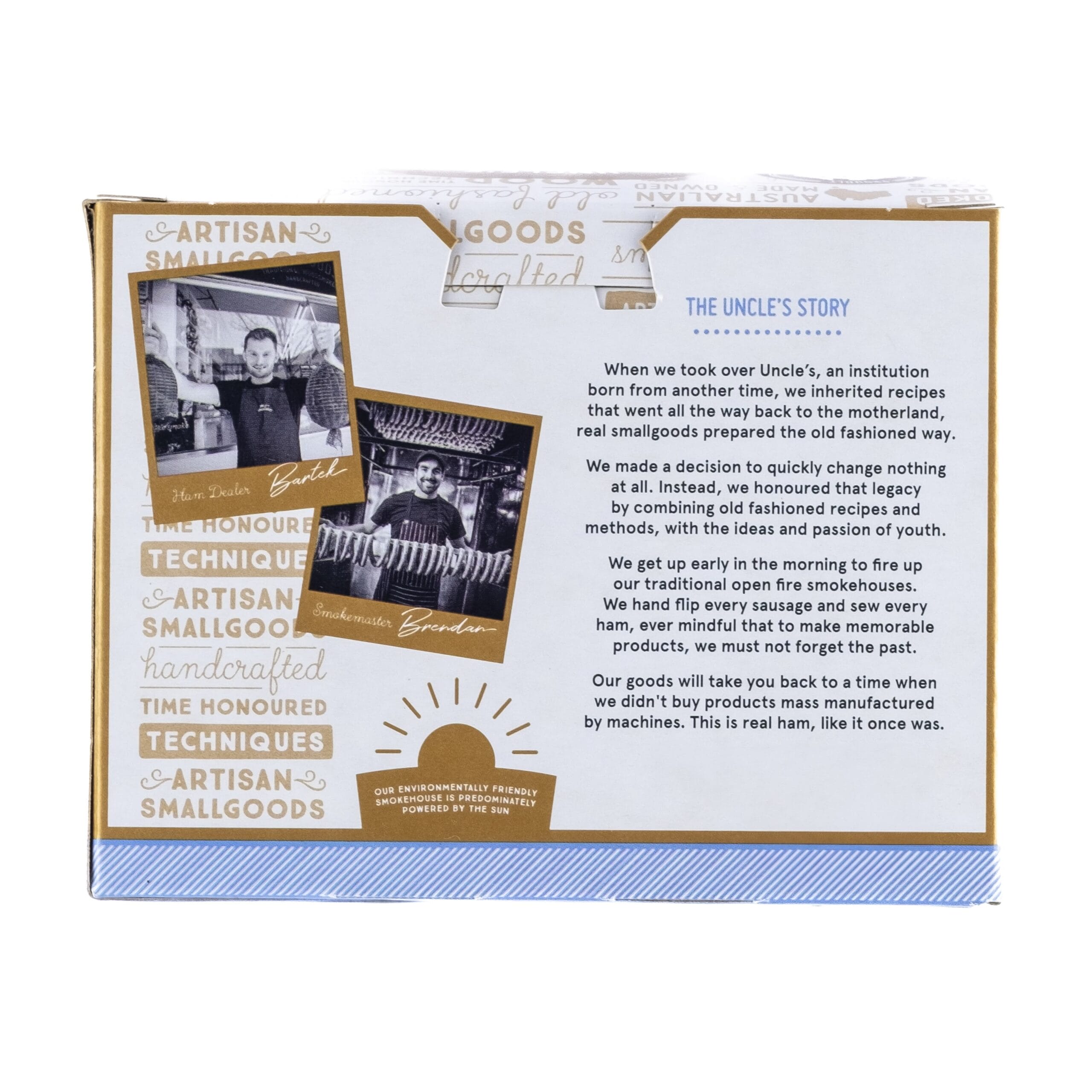 Same recipe for 30yrs, hand made using old-fashioned time-honoured techniques and wood smoked 6 hours. Uncle’s hams will take you back to a time before you bought products mass manufactured from personality free supermarket fridges.